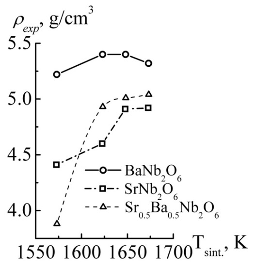 Dependence of experimental density, ρexp., on sintering temperature, Tsint., for BaNb2O6, SrNb2O6, Ba0.5Sr0.5Nb2O6.