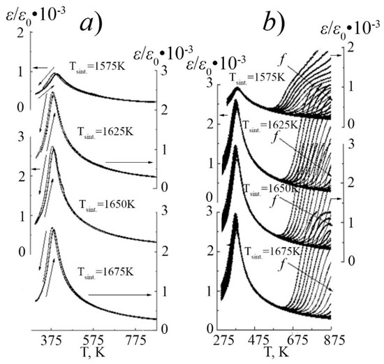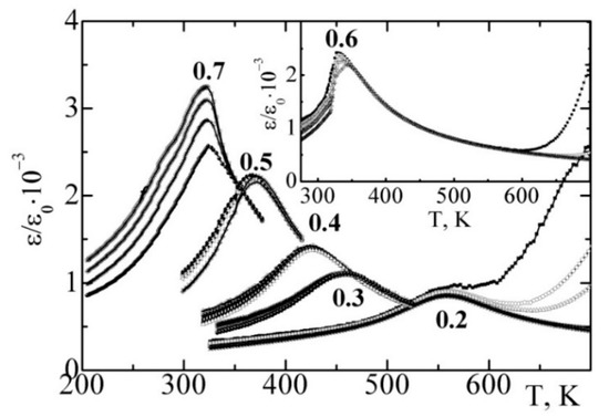 High- temperature dielectric spectra were examined by means of the precision LCR-meters (Agilent 4980A: Agilent Technologies, Santa-Clara, CA, USA; WayneKerr 6500B: Wayne Kerr Electronics, London, UK). The measurements were carried out in the temperature range of (300–920) K and in the frequency range f = (20–106) Hz. The microwave absorption of the ceramic samples was investigated using method presented in Reference [8].