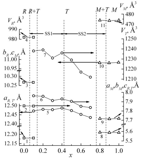Dependencies of parameters and cell volume of SS Ba1−xSrxNb2O6 on x: 1-aP, 2-cP, 3-bP, 4-VP—rhombic, 5-aT, 6-cT, 7-VT—tetragonal, 8-aM, 9-bM, 10-cM, 11-VM—monoclinic (the size of the marker corresponds to the measurement error).