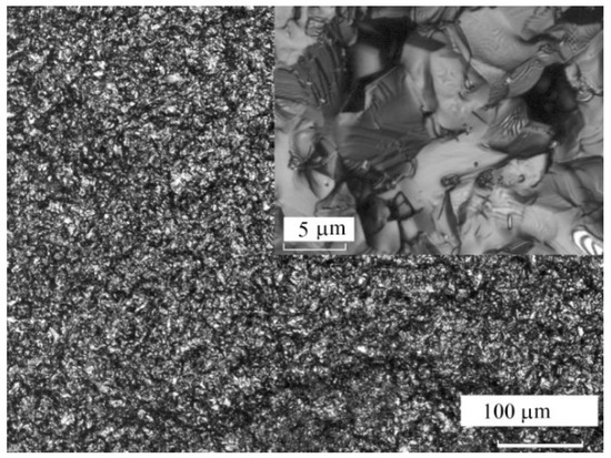 Figure 4 shows the ε/ε0(T) dependences of ceramics with x = 0.2 ÷ 0.7 (Δx = 0.1) in the temperature-frequency range under consideration, obtained in the cooling mode. It can be seen that the ε/ε0(T) dependences are in accordance with the phase diagram of the system: increase of Sr content leads to an increase in the relaxation properties, accompanied by a large blurring and a shift towards room temperatures in the region of the ferroelectric-paraelectric phase transition, which correlates with Reference [11]. Barium strontium niobate ceramics have a homogeneous, dense, practically non-porous microstructure (Figure 5) from crystallites of size (5 ÷ 10) μm, which indicates a sufficiently high quality of the studied object.