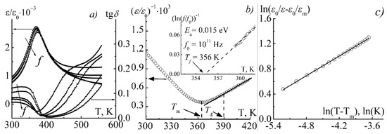 Dependences ε/ε0(T), tgδ(T) (a) f = 10 ÷ 105 Hz (a) (the direction of f growth is indicated by an arrow), (ln(f/f0))−1(T) and (ε/ε0)−1(T) at f = 105 Hz (b), ln(ε0/ε − ε0/εm) on ln(T − Tm) (c) in BSN-50 ceramic.