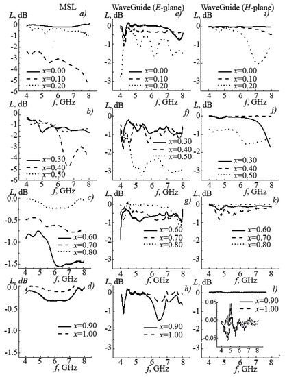 In the first method, the micro strip line (MSL) was used as a transmission line (Figure 7a–d), in the second method, a rectangular waveguide (Figure 7e–l). In both cases, the sample was placed in the region of the transmission line near the maximum concentration of the electric electromagnetic field. In this case, the sample was placed in two directions in the waveguide line: in the E-plane (Figure 7e–h) and H-plane (Figure 7i–l).