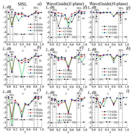 Dependences of L(x) with superposition of the phase diagram of the system. (MSL (a–c), waveguide line in the E-plane (d–f) and H-plane (g–i)).