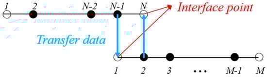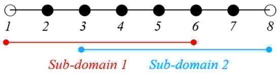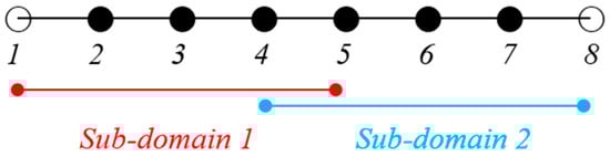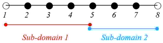 Figure 3 shows the entire domain decomposed into two subdomains without overlapping points, where the first subdomain includes five points from points 1 to 5, and the second subdomain includes four points, from 5 to 8. If the parallel computation based on the domains is performed with a linear interpolation, the matrix S in Equation (11) is modified as follows: