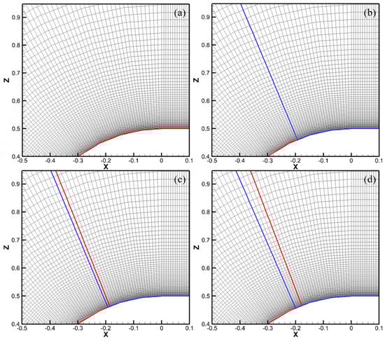 The dual-time preconditioned system is numerically solved using the alternating direction implicit (ADI) method [] in structured grids. The convective flux term is approximated using the monotonic upstream-centered scheme for conservation laws (MUSCL) with third-order accuracy []. A second-order backward difference is used to discretize the physical time derivative. A first-order backward difference is used to approximate the pseudo-time derivative. At each physical time step, a pseudo-time iterative procedure is applied with a critical residual of 10−4.