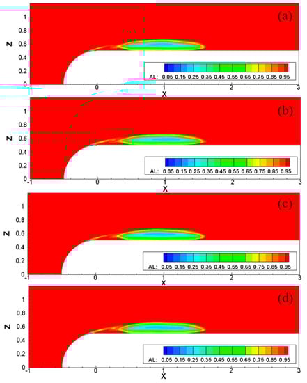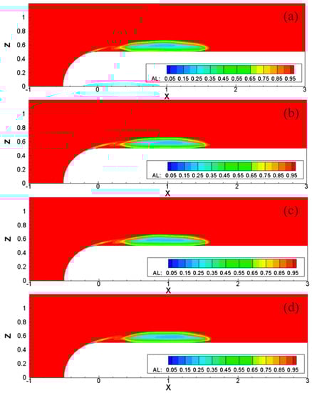 Figure 8 shows the distribution of the cavitation flow around the body in terms of the water volume fraction where AL = 1 and AL = 0 denote pure water and vapor, respectively. The overall distributions of cavitation in all of the cases are similar to each other, which confirms the validity of the parallel computations. However, the pressure distributions on the body are compared with the measured data to examine the effects of the interface boundary conditions in further detail.