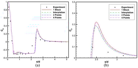 Figure 10 shows the pressure distribution around the interface boundary to highlight the accuracy of the four-point overlapped method. With the exception of the case of the single block and four-point overlapped methods, an abrupt change in the slope of pressure contours is observed across the grid interface line between the subgrids. The discontinuity leads to an observed difference in the mean pressure coefficients, as shown in Figure 9. Overall, the four-points overlapped method for the interface boundary in the parallel computation in combination with the multi-subgrid method provides numerical results with an accuracy that is equal to that of the serial computation at a lower numerical time value. In all of the subsequent parallel numerical simulations, the four-point overlapped method is used to illustrate its efficiency.