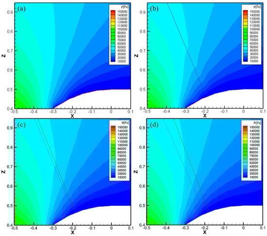 Contours of pressure around the interface boundary at t* = 30; (a) single block, (b) linear interpolation, (c) two-point overlapped, (d) four-point overlapped.