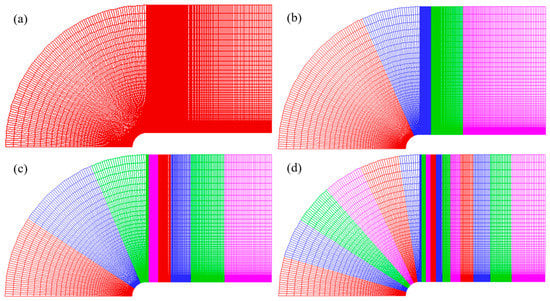 As described in the previous section, interface boundary conditions are required for parallel computations based on multidomain methods, and are critical in terms of the overall accuracy of parallel computations. The types of interface boundary conditions depend on the associated multidomain methods, namely the number of overlapped grid points. Three types of interface boundary conditions, including linear interpolation, two-point overlapped methods, and four-point overlapped methods, are used. Figure 7 shows a magnified view of the grids that were used for the serial and parallel computations. In Figure 7a, the computation domain consists of a single domain used for the serial computation. The results obtained from the serial computation based on the single domain are used as the reference results by which the accuracy and efficiency of the parallel computations are assessed. The validity of the serial computation is confirmed by comparing its results with the measured data. In the other parallel computations, the computational domain consists of multi-subdomains.