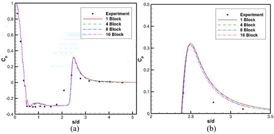 Figure 13 shows the distribution of the mean pressure coefficient that is obtained from each case in conjunction with the measured data. The results indicate excellent agreement between the serial and parallel computations, although the difference slightly increases when the number of sub-blocks increases.