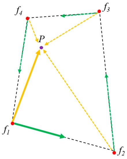 It is important to determine donor cells that contain target interpolation points. Graham’s scan method [] is used in the study, although there are several extant methods to identify donor cells. The method uses the cross-product sign. As shown in Figure 16, the values of the cross product between the vectors defined along the side edge of the cell (green-colored vector) and the vector formed between the vertex of the cell and the interpolation points (yellow-colored vector) are always positive, because the product order is in a counterclockwise direction as follows (in a two-dimensional space):