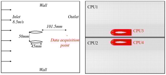 Figure 18a shows the high-speed cavitation tunnel in the Korea Research Institute of Ships and Ocean Engineering (KRISO), where the experiment on gust flow was carried out. Figure 18b shows the gust generator consisting of twin hydrofoils with its driving system. The tunnel exhibits a rectangular test section with dimensions of 3000 mm (X) × 300 mm (Y) × 300 mm (Z), where the coordinates denotes the directions of main flow stream, the height, and the width, respectively. The flow velocity that is generated is up to 20.4 m/s []. The hydrofoil was used as the gust generator []. The gust generated by the twin hydrofoils is convected downstream at the mean flow velocity, oscillating at the prescribed frequencies. To measure the velocity of gust flow at the data acquisition point shown in Figure 19a, one-dimensional laser Doppler velocimetry (FlowExplorer 300 by Dantec Dynamics) was used with an uncertainty of 0.04% []. The data acquisition point is placed to be the center point between the trailing edge of the hydrofoil and the position of the head of a submerged projectile, which will be placed to investigate the effects of incoming gust on its cavitation shape in a future study. Figure 19a shows the entire computational domain, including the twin hydrofoils with the applied boundary conditions. The computation domain is constructed by using the two-dimensional section, of which the dimensions are 350 mm (X) × 300 (mm) (Y), where the length in the main flow direction is shortened for the reduction of numerical gust. The upper and lower boundaries are set as the solid wall on which no-slip boundary condition (BC) is applied. The left boundary is set as the inlet boundary on which the uniform velocity of 8.5 m/s in the horizontal direction is prescribed. The right boundary is set as the outlet boundary with the prescribed static pressure. The computational domain includes four domains (i.e., two background and two hydrofoil-fitted grid domains), as shown in Figure 19b. The hydrofoil-fitted grid domains oscillate in a pitching direction with prescribed amplitudes and frequencies corresponding to 4°, 6°, and 8°, and 5 Hz, 10 Hz, 15 Hz, and 20 Hz, respectively.
