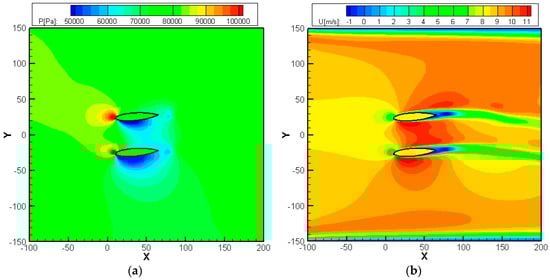 Snap shot of pressure and u-velocity at maximum angle (8°) of hydrofoils: (a) pressure; (b) u-velocity (black line: hydrofoils).