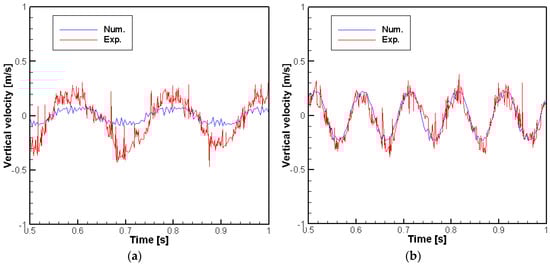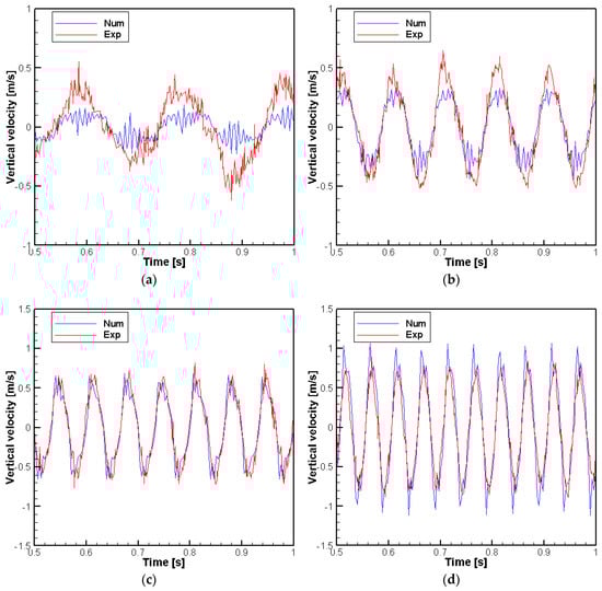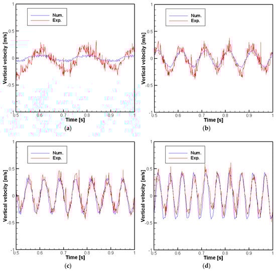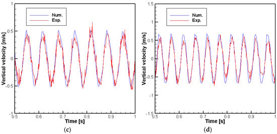 Figure 21, Figure 22 and Figure 23 show the predicted time histories of the v-velocity component recorded at the data acquisition point due to the gust flow generated by the pitching hydrofoils at the amplitudes and frequencies as listed above. Periodic fluctuations in the velocity are observed in all of the cases. This implies that the twin pitching-hydrofoils successfully generate gust flow with periodic velocity components in a direction that is normal to the mean flow. In case of the 5-Hz frequency, a difference exists between the numerical and experimental results. This is because the oscillation frequency of the hydrofoils is extremely low, such that its wavelength is relatively long when compared with the size of the computational domain, and thus, the related vortical waves are increasingly affected by the boundary conditions. It is well known that any of the outflow boundary conditions do not work well for the low-frequency components of the wavelength comparable to the dimension of the entire computation domain []. In the present study, the lowest frequency of the vortical waves is 5 Hz, and the mean flow speed is 8.5 m/s, which results in the wavelength , which is much larger than the dimension of the computational domain. However, as the oscillation frequency increases, there are closer agreements between the numerical and the experimental results. To ensure the property of the current numerical scheme and preserve the dispersion relation, which is an important parameter for determining the ability of this numerical scheme to simulate wave-type phenomena, the numerical wave number of the present scheme needs to be analyzed [,,,,,]. The critical wavenumber can be defined as , according to which the critical wavenumber of the present scheme is . This implies that the vortical wave satisfying the unequal equation can be simulated using the proposed numerical scheme with negligible dispersion and dissipation errors. The grid for the part where the gust flow is generated is set to be 2 mm (X) × 1 mm (Y). Therefore, the present scheme can simulate the gust wave with a frequency of up to . The results also indicate a similar trend wherein increases in the amplitude or the frequency increase the maximum velocity.