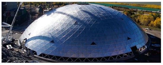 A hemispherical shell is widely used in large span structures, which have been constructed in large public buildings such as gymnasiums, exhibition centers, and opera houses [,]. Such curved shapes are often used for steel shells and rod structure as they are naturally strong structures, allowing wide areas to be spanned without the use of internal supports, giving an open, unobstructed interior. Figure 1 shows a geodesic dome for digital artwork that was established in 2014 []. The use of steel as a building material reduces both material costs and construction costs, as steel is relatively inexpensive and easily made into compound curves. The shell structure tends to be immensely strong and safe. For example, modern monolithic dome houses have resisted hurricanes and fires. In recent literature, there has been renewed interest in the problem of a hemispherical shell vibrating in contact with air or other fluids []. The vibrations of a structure induce local air movement, while the moving air and global atmospheric pressure affect the structure at the same time. Such phenomenon is called fluid–structure interaction (FSI) effect.