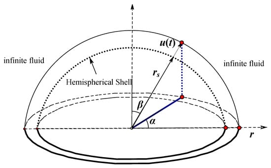 Figure 2 shows a mechanical model of a hemispherical shell vibrating in a radial direction in the unbounded fluid. Obviously, structure vibration affected the boundary of flow, while the pressure of flow affected the structure simultaneously. With an inviscid fluid hypothesis, the assumption of , and the character of axial symmetry, the FSI coupling equation can be simplified as follows [], where represents the areal density of the shell, represents the displacement of vibration, represents the bending stiffness, represents the velocity of fluid in the radius direction, and represents the pressure differential between the upper surface and the bottom surface of the shell.