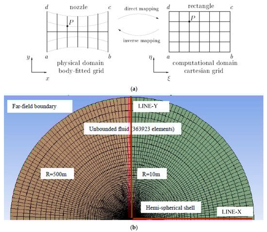Equations (36) and (37) are one and two-dimensional schemes, respectively, in which is the value of physical quantities such as velocity and pressure, and are the coordinates. Usually, the grid will not be the rectangular shape. Let the transformation of domain be as Equation (36), shown in Figure 3a.