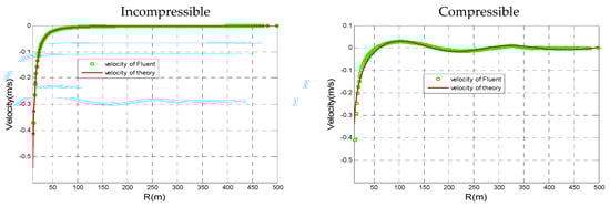 Figure 4 shows the relationship of the velocity versus radii, which are the results under the incompressible/compressible assumption at 1.0 s. From both the left graph and the right graph, it can be seen that the analytical solution is in very good agreement with the numerical solution. The correlation coefficient in the left and right plot is 0.987 and 0.973, respectively. From the theoretical solution, boundary vibration is transmitted to the whole flow field in an instant under the incompressible assumption. Meanwhile, in the compressible condition, the transmission of the boundary motion to a far field needs a period of time.