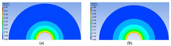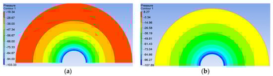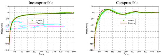 Compared with both the left and right plots, it can be found that the pressure of fluid in the incompressible fluid is a function of radii, which decreases with the function of . Conversely, the pressure of fluid in the compressible fluid is a function of velocity, which can be rationalized by both of the right plots in Figure 6 and Figure 7.