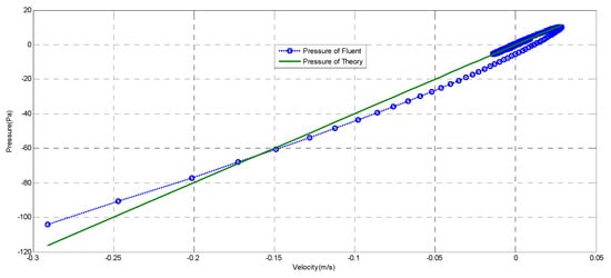 Figure 8 shows the curve of pressure versus velocity in the numerical solution and the analytical solution. The analytical solution predicts that the pressure is proportional to the velocity; the ratio is = 417. The slope of the fitting curve is 408 with the 95% confidence bounds, which is consistent with the expected results well.