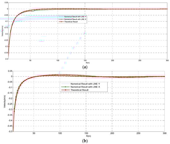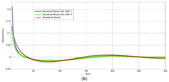 To extend the applications of the analytical formulations, two more hemispherical shells rotated by the generatrix of the elliptical curve were conducted, which was inspired by the previous studies [,,,]. The length of major axis A was set to 10 m, which is the same as the conditions of hemisphere shell above, and the length of minor axis B was set to 8 m and 6 m, respectively. To compare the difference in the major axis and minor axis, the results of two lines, including X ranging from 10 m to 300 m with Y = 0, which is called LINE-X, and LINE-Y ranging from 8/6 to 300 m with X = 0, which is called LINE-Y, were investigated below.