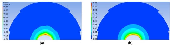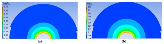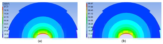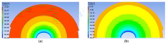 Figure 15 illustrates the contour slice of the pressure in the incompressible and compressible fluid conditions, respectively. From Figure 15, it is clear that in the middle of the shell, the velocity is larger than that of the side. Since in this situation, the slope at the side is larger than that at the middle, the fluid can distribute within the other domain close to the side boundary. In this case, the velocity of fluid decreases faster than that of the middle position.