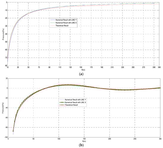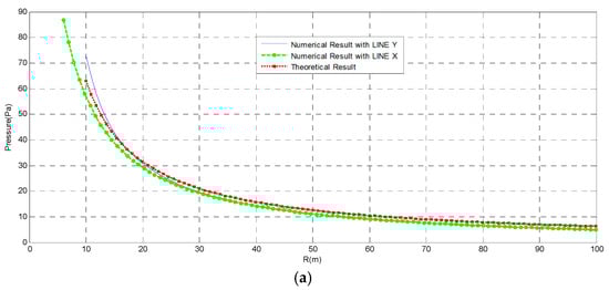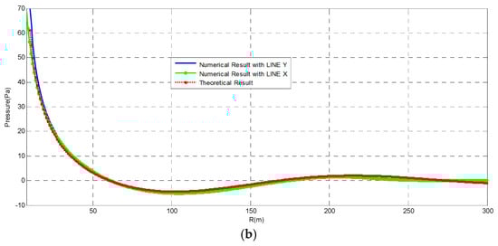 On the basis of the preceding analysis, in order to find and check the validity of the theory, a hemispherical shell submerged in unbounded fluid was examined using a CFD analysis using a commercial computer code, ANSYS (release 17.0, Ansys Company, Canonsburg, PA, USA) []. The CFD model has the identical shell geometry, boundary conditions, and material properties that will be used in the theoretical calculation. Similar applications can be found in some papers [,]. The radius of the hemispherical shell is set to 10 m, and the unbounded fluid is simulated as a far field boundary whose radius is 500 m (see Figure 3b). The physical properties of the fluid are as follows: density = 1.225 kg/m3, sound velocity c = 340 m/s. The viscosity of the fluid is neglected in both the theoretical analysis and the CFD calculation. The purpose of the present paper is to verify the principle of pressure under the vibration of the shell. The movement of the hemispherical shell was set as uniform vibration in the radial direction, which was also the boundary of the fluid. As for the numerical simulation parameters, the far field boundary is set to be the pressure far field, reference pressure to zero, movement boundary to U(t) = sin(10t), calculating time to 1.0 s, and the delta-time to 0.001 s. A simple scheme second-order method was accepted for the CFD simulation, and the initial condition of fluid was set to be stationary. For comparison, both the compressible fluid case and the incompressible fluid case were carried out. To verify the solution, the line from to , which data was obtained from, is shown as LINE-X in Figure 3b.