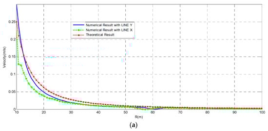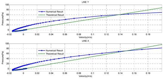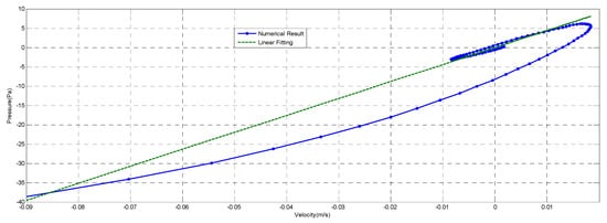 Figure 13 shows the curve of the pressure versus velocity in the numerical solution and the analytical solution. In this situation, the slope of the fitting curve is 427 with 95% confidence bounds, and the predicted value is 407, which is consistent with the expected results. It is noticeable that the smaller the radius, the larger the gap between the analytical and numerical result. That is because when , which is linear to R, is smaller, is the approximations that are shown in Equations (33) and (15) are worse.