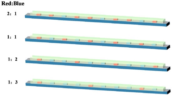 In order to fully stimulate the red-emitting phosphors and let parts of the blue light overflow stimulate the green emitting phosphors, a small improvement was applied to the filament structure. As shown in Figure 3, blue chips were arranged regularly between red CSP LEDs, and the proportions of red CSP and blue light chips were 2:1, 1:1, 1:2 and 1:3, respectively. This package can be seen as a combination of stacked-type and segmented-type packages. The mass fraction of red CASN:Eu2+ in the film was determined, and the mass fraction of green LuAG:Ce3+ and the proportion of CSP and blue chips is controllable. Thus, luminous performance can be designed by controlling these two parameters.