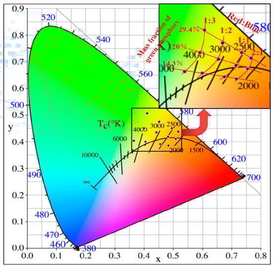 - Xiao, R.; Liang, X.; Li, P.; Di, X.; Xiang, W. A thermally stable warm WLED obtained by screen-printing a red phosphor layer on the LuAG:3+, PiG substrate. Chem. Eng. J. 2016, 306, 858–865. [Google Scholar]