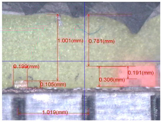 Figure 5 shows the practicality of two samples before and after the second-layer packaging. The first two samples were pure red CSP filaments, before and after the green LuAG:Ce3+ packaging, respectively. The last sample was our designed filament, with a CCT of 2500 K, which emits the warm white light, and the upper one is the sample before the designed 2500 K filament packaging. It can be seen that the colors of each sample’s emitting light were different. Although the last filament in Figure 5 is a segmented-type luminescence design, the luminescence appeared very homogeneous. This phenomenon was due to the second layer of green packaging providing ample space for light reflection, diffusion and deflection in the silicone matrix. The CSP filament of the laminated package is shown in Figure 6, and the dimensions of each part can be seen clearly. The thickness of the green packaging layer was nearly three times that of the red film thickness, which was a favorable space for photon multiple conversions, so the filament could give uniform illumination.