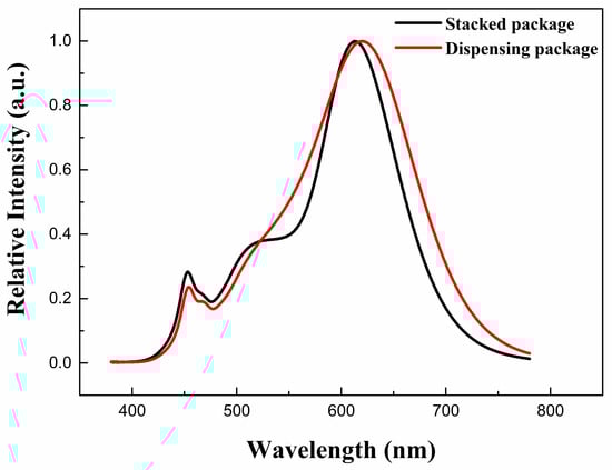The EL emission of the stacked package and traditional dispensing package filaments, shown in Figure 7, were composed of a blue emission at 450 nm, and a broad emission that occured at wavelengths ranging from 500 to 700 nm, the former from the InGaN LED chip and the latter from the green LuAG:Ce3+ and red CASN:Eu2+ phosphors. The green EL emission intensity of the stacked-type packaged filament was found to be higher than the traditional dispensing packaged filament. This may be ascribed to the decreased absorption of the LuAG:Ce3+’s green emission by the red-emitting CASN:Eu2+ phosphor, thereby increasing green emission intensity. These phenomena clearly indicated that spectral overlapping was effectively reduced using a stacked-type package and segmented-type luminescence design. The decrease in spectral overlapping observed in the current design of the CSP filament can be attributed to the successful organization of the proximity of the luminescent elements in the assembled CSP filaments. The interaction of these optical centers at an optimum distance promotes the spatial delocalization of energy, minimizes energy transfer between the luminescent centers and thereby reduces the spectral overlapping.
