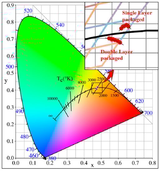 CIE-1931 chromaticity coordinates of traditional dispensing packaged filament and stacked-type packaged filament.