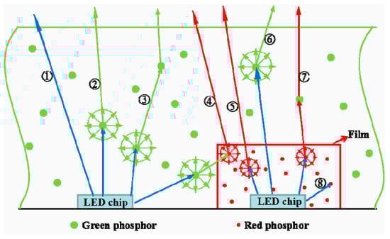 Within the optical tracing process, the light scattering, absorption and conversion are normally considered as dominant effects in most YAG based yellow phosphor models [27]. As shown in Figure 9, light 1 is the blue light emitted by the chip, which is directly emitted through the package. When the blue light emitted by the chip propagates to the green phosphor, it is absorbed and transformed into green light like light 3, and the propagation direction is isotropic. Light 3 shows that the green light is not absorbed, but directly scattered through the green phosphor when the light fired by one green powder again propagates to another green phosphor. There are very few blue lights absorbed by the green phosphor that can propagate to the red phosphor, as light 4, that can then reabsorb the photon and turn into red light. The transmission direction of the emitting light of the red phosphor follows the same isotropy. When a blue light emitted by the chip reaches the red phosphor in the film, it is converted into red light like light 5, and then directly ejected. Some light, like light 6, does not reach any red phosphor and goes straight through the film. This kind of blue light is only absorbed by the green phosphor and emitted into green light. Light 7 indicates that the emitting light of the red phosphor will not be absorbed when the emitting light of the red phosphor is transmitted to the green phosphor, but instead the scattering phenomenon occurs. Light 8 indicates that blue light is absorbed by the red phosphor and no spectral transformation occurs. This is because the quantum efficiency of the red phosphor is much lower than that of the green phosphor, and the probability of non-radiative recombination is larger.