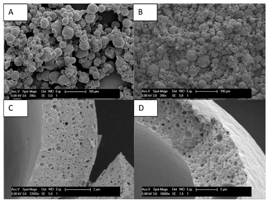 The typical outer topography (A,B) and inner structure (C,D) of the investigated spray-dried microcapsules. Microcapsules in (A–D) were prepared with CIWE 2.5/17.5/25:75, 5.0/15.0/50:50;2.5/17.5/25:75, and 5.0/15.0/50:50, respectively.