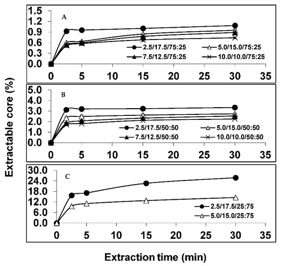 Effects of wall composition and extraction time on the extractable core from spray-dried microcapsules that were prepared with CIWEs at a wall-to-core ratio of 75:25 (A); 50:50; (B) and, 25:75 (C).