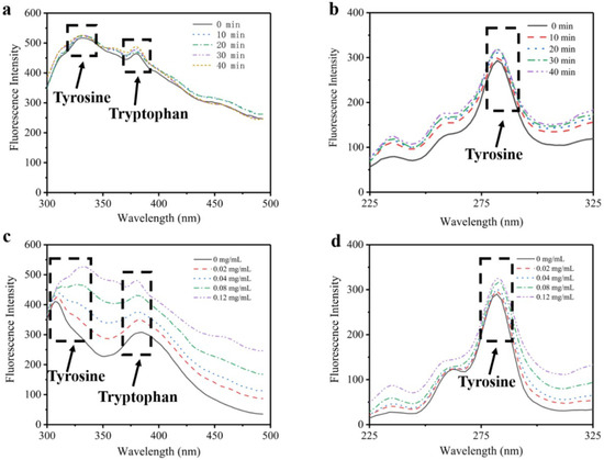 Due to a lack of phenylalanine and tryptophan [19,20], the intrinsic fluorescence of type I collagen is presumed to be dominated by tyrosine. Compared to traditional fluorescence technology, synchronous fluorescence technology can scan monochromators of excitation and emission simultaneously. Therefore, synchronous spectroscopy has the more obvious advantages of simplifying spectroscopy, increasing sensitivity and reducing interference [21]. Figure 1 shows the changes of intrinsic florescence intensity of type I collagen influenced by collagenase concentration and time. It reveals that the fluorescence intensity and the synchronous fluorescence intensity increased with increasing collagenase usage. As presented in Figure 1a,c, the peaks at 310 nm and 370 nm represent the existence of tyrosine and tryptophan, respectively [22]. After adding collagenase I, the intensity of the tyrosine peak increased with rising time and concentration. It illustrates that type I collagen aggregation was cleaved by collagenase I, which resulted in exposure of tyrosines wrapped in collagen, and thus the intrinsic fluorescence of type I collagen increased with stronger binding to tyrosine. From Figure 1b,d, it is seen that the intensity of the peak at 280 nm increased with the addition of collagenase I, which represented an increase in the number of tyrosine residues.