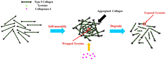 The reaction mechanism can be further illustrated by Figure 2. When type I collagen was dissolved in acetic acid solution, it would form aggregates by self-assembly [23]. A large number of tyrosine residues of type I collagen were wrapped in polypeptide chains, which reduced intrinsic fluorescence intensity. Owing to the cleavage specificity of collagenase I [24] in the sequence of Gly-Pro-X of collagen [25], the aggregated collagen could be degraded into small fragments and the tyrosine residues were exposed for further binding. This enhanced the intrinsic fluorescence intensity of type I collagen.