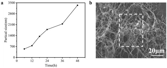 (a) The changes in particle size of type I collagen from 6 h to 48 h. (b) SEM analysis at 48 h (×1000).