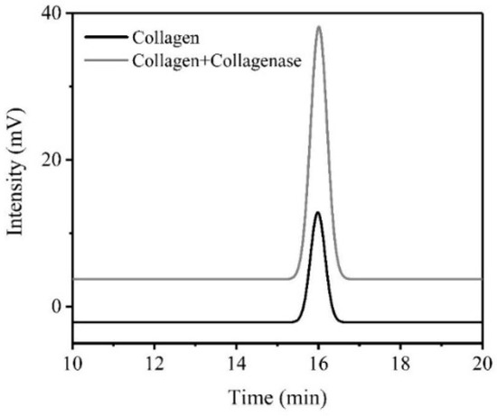 The peak appearing at 16 min represents tyrosine (Figure 4), while the peak area correlated with the tyrosine concentration [31]. It was obvious that dialysate type I collagen with collagenase I contained more tyrosine than without collagenase, which could further demonstrate the theory in Figure 2. Owing to the cleavage of collagenase to the self-assembly aggregated collagen, the tyrosine residues wrapped in collagen would be exposed. Based on the results mentioned, it proved that collagenase I could improve the exposed tyrosine concentration in type I collagen, which resulted in an increased intrinsic fluorescence intensity of type I collagen finally.