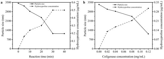 The changes in particle sizes and hydroxyproline in the solution. (a) Dissociation influenced by different reaction time (0, 5, 10, 20, 30, 40 min). (b) Dissociation influenced by different concentration of collagenase I (0, 0.02, 0.04, 0.08, 0.12 mg/mL).