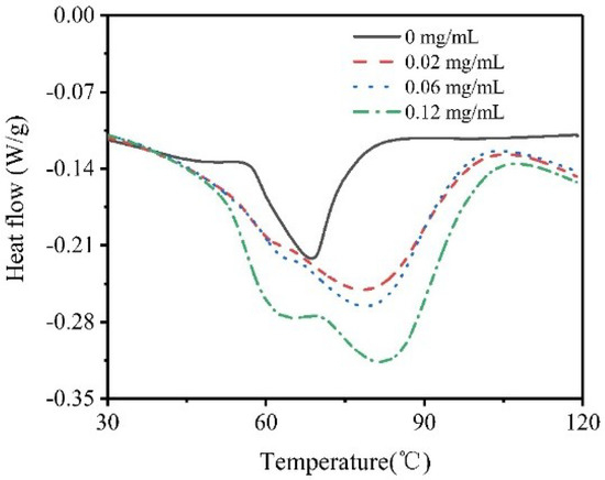 The thermostability of type I collagen with different concentrations of collagenase I were measured by DSC. The endothermic peak related to the transformation of collagen structure, which varied from triple helical to random coil [33], while the peak value was generally considered as the denaturation temperature (Td) [34]. The improvement in Td resulted from changes in type I collagen structure, where the fiber surface was cleaved and some functional groups were exposed. Figure 7 shows that the denaturation temperature of type I collagen increased with increasing concentration of collagenase I, which resulted from aggregation status changes of collagen molecules. The Td of collagen with 0.12 mg/mL collagenase I was highest because the short fragments, cleaved by collagenase [35], were hard to thermally decompose. In other words, the proper degradation degree could improve the exposure of more tyrosine residues and result in better thermal stability.