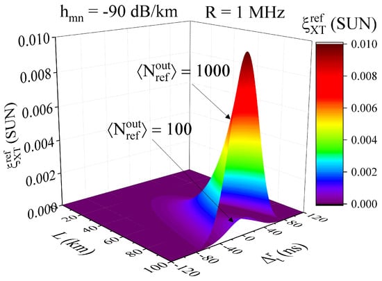 where is the time delay between the phase reference pulse in core m and the most nearby quantum signal pulse in core n, is the time delay between the quantum signal pulse in core m and the most nearby quantum signal pulse in core n, is the half-width of the pulse (at 1/e-intensity point), and are the overlapping factor [34], is the mean photon number of the phase reference pulse in the core m, is the mean photon number of the quantum signal pulse in the core m, is the excess noise contributed by the phase reference pulses, is the excess noise contributed by the quantum signal pulses, R is the repetition rate of CVQKD system, is the insert loss of the FIFO, is the detector quantum efficiency. We only consider the adjacent 3 quantum signal pulses and phase reference pulses (corresponding to ), and others’ impact can be neglected as the overlapping factor will be too low. The phase reference pulse would be the LO pulse or the weak reference pulse [8,9,10]. We assume that all the pulses are the Gaussian pulse shape with the same pulse width. Note, as the coupling between cores occur randomly, the polarization state of the crosstalk will be randomized and chaotic. Consequently, there is a factor of 1/2 in Equations (4) and (5) due to the polarization selection of the LO. According to Equation (4), we show the excess noise contributed from the weak reference pulses in Figure 2, where the pulse width is 50 ns, is 0.2 dB/km, R is 1 MHz and the coupling coefficient takes an ultra-low value of −90 dB/km [31]. Usually, the mean photon number of the weak reference pulse is about 100∼1000 at the fiber output. Therefore, the resulting excess noise contributed from the weak reference pulse cannot be neglected when approaches to zero. We do not show the impact of the quantum signal pulse as its impact is much lower than the weak reference pulse’s, although the quantum signal pulse’s impact will be non-negligible when dB/km, and . We also do not show the contribution of the LO, as its mean photon number ( as usual) is much larger than the weak reference pulse so that its excess noise contribution is unbearable. Consequently, the excess noise contributed by the inter-core crosstalk may become very large for the MCF-based CVQKD when the wavelengths of quantum channels in all cores are equal, even though the using of the ultra-low crosstalk MCF. In practice, for the improvement of the communication capacity, we should use a smaller core pitch and hence more cores MCF, leading to a larger coupling coefficient. Therefore, an effective suppression of the impact of the inter-core crosstalk can increase the secure key rate of MCF-based CVQKD system. Note, the calculations above assume that the time delay of and between pulses are invariable. This assumption may not follow the real situation when we use heterogeneous MCF, but this does not affect our analysis above as we can use an average value to take the estimation.