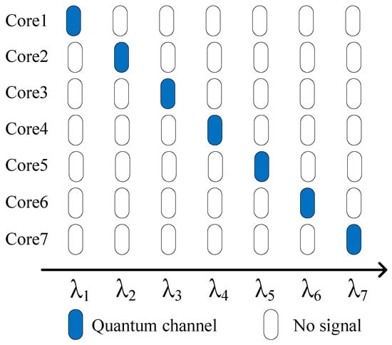 To suppress the impact of the inter-core crosstalk to the quantum channel, we consider this problem in three points. First, we can monitor pulses time delay between cores constantly. This method is feasible for few-core and low-speed MCF-based CVQKD system as the pulse period is large and the adjacent cores of one core is few. However, this approach will increase the system’s cost, which is increased with the system’s core number and the repetition rate. Therefore, it is not a good solution. Second, we consider using a low coupling coefficient MCF so that the excess noise contributed by the inter-core crosstalk is lower than ( is the shot noise), and hence this excess noise can be neglected [35]. This method is straightforward. However, it will bring about challenges of MCF fabrication technique or decrease the total communication capacity of the system. Take the central core of a 7-core MCF for example. For the transmitted LO scheme, the coupling coefficient should be lower than −157 dB/km when the output mean photon number of the LO is . It is so hard to fabricate a so low coupling coefficient MCF, when maintaining a relatively small core pitch (45 μm for example [31]). For the locally generated LO scheme, the conservative value of the coupling coefficient should be lower than −107 dB/km when the mean photon number of the weak phase reference pulse is 1000. The fabrication of this value of coupling coefficient for MCF is also a challenge. Actually, one can increase the core pitch to decrease the coupling coefficient of MCF, but this approach will also decrease the core density of MCF and degrade the total communication capacity indirectly. Therefore, using a low coupling coefficient MCF to remove the impact of inter-core crosstalk is not preferred in practice. Note, the excess noise should be the sum of all the adjacent cores’ contributions, and the conservative estimation of the coupling coefficient above is under the assumption of and km. Third, we consider staggering the wavelength of quantum channel in each core. If the wavelength of the inter-core crosstalk differs from the wavelength of the quantum channel, it can be removed by filtering technology at the receiver [36]. Moreover, the mode selection of the LO can restrict this noise further [37]. Consequently, this method can be ready to realize in present technology and appears good at noise suppressing. To restrict the impact of the inter-core crosstalk, we propose the channel wavelength distribution scheme in Figure 3, where all the wavelengths of quantum channels are different. Under this condition, the wavelength of the inter-core crosstalk in each core will be different from the wavelength of quantum channel and this crosstalk can be removed out at the receiver. Therefore, a good channel wavelength management can put down the impact of the inter-core crosstalk.