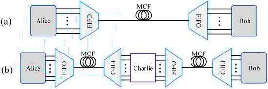 The MCF-based CVQKD protocols. (a) The one-way or two-way CVQKD protocol. (b) The MDI CVQKD protocol. FIFO: fan-in/fan-out.