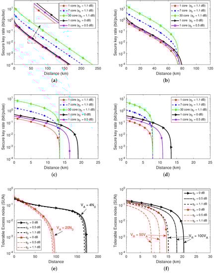 where is the Shannon mutual information between Alice and Bob, and is the Holevo bound in the information between Bob and Eve. Appendix A gives the calculations of and . The numerical results of the one-way protocol are shown in Figure 5, where (a) and (b) represent the results of the transmitted LO scheme while (c) and (d) represent the results of the locally generated LO schemes. Here Alice’s modulation is set to and in Figure 5a,b, and 40 in Figure 5c,d, respectively. As shown in Figure 5 we find that although the secret key rate of one-core-based CVQKD may be slightly smaller than that of the original SMF-based CVQKD, the total secret key rate is still improved for the MCF-based system. The decreasing secret key rate of one-core-based CVQKD is due to the insert loss of the FIFO. When this insert loss decreases to a threshold, its impact can be nearly neglected, as the violet lines shown in Figure 5a,b, where the insert loss of the FIFO is set to 0.5 dB. We can also find that the insert loss of the FIFO has less influence to the transmitted LO scheme than the locally generated LO scheme, especially when is close to the optimal value of . This result can also be reflected by the simulation of tolerable excess noise. We have shown the tolerable excess noise for one-way protocols in Figure 5e,f, when takes different values. It shows that the locally generated LO scheme is more sensitive to the insert loss of the FIFO. Therefore, with lower insert loss of the FIFO and more cores of MCF, the performance of the MCF-based one-way CVQKD protocols can be improved better. We note that the numerical results of the two-way protocol is similar to that of the one-way protocol, and hence can be ignored for simplicity.