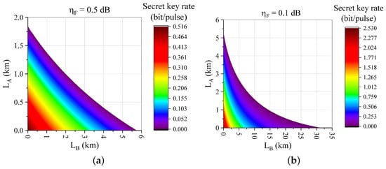 where , , , and . is the distance between Alice and Charlie, and is the distance between Bob and Charlie. However, we could not obtain a positive secret key rate for dB. The reason is that the insert loss of dB is equivalent to an extra distance of km, which is equivalent to add km initial distance between Alice and Charlie. Unfortunately, the secure distance of the MDI CVQKD protocol will decrease rapidly with the distance between Alice and Charlie [16], which prevents us to obtain a positive secret key rate for dB. Furthermore, although is set to dB or dB, the secure transmission distance is also short with , as shown in Figure 6, where the reconciliation efficiency is set to 1. In practice. The results in Figure 6 may become even worse since the reconciliation efficiency is not able to achieve 1.