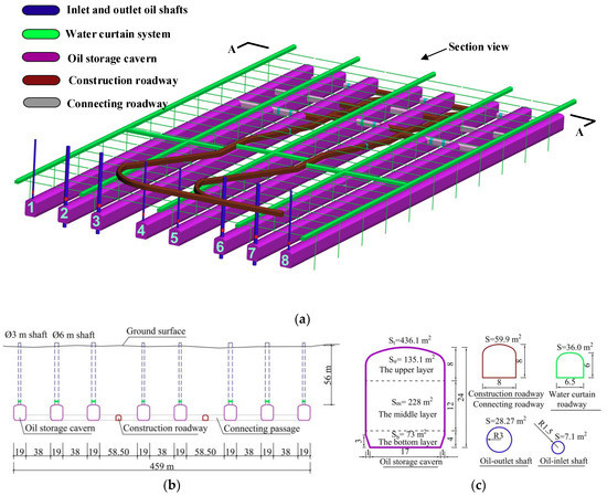(a) Three-dimensional layout of underground structures; (b) The profile of oil storage caverns; (c) The shape and size of each cavern section.