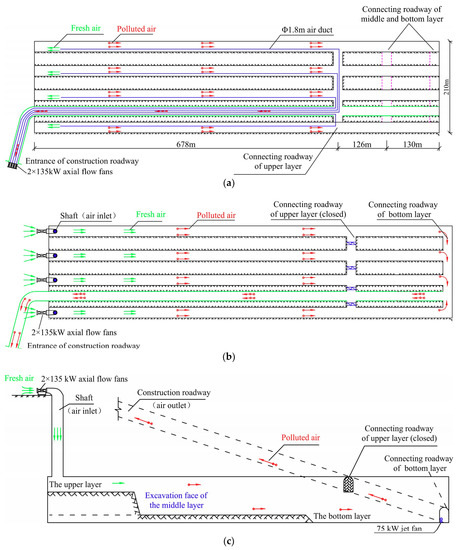 (a) The plan for the forced ventilation scheme; (b) The plan for axial-flow gallery ventilation scheme; (c) The profile of the axial-flow gallery ventilation scheme.