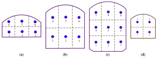 Layout of test points in each section: (a) Section of the upper layer; (b) Section of the middle layer; (c) Full section of the cavern; (d) Construction roadway.